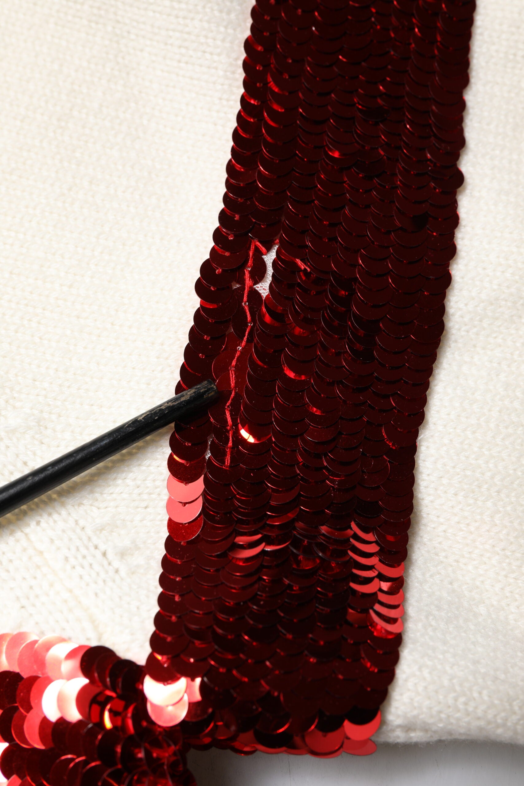 This item has a minor defect, there are repaired red sequins on the left sleeve (see pictures for details).